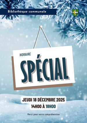 Fermeture de Noël : du 20 décembre au 7 janvier 2026. Par ailleurs, la bibliothèque fermera exceptionnellement ses portes le jeudi 18 décembre 2025 à 18h00 et non à 19h00. Nous vous remercions de votre compréhension.