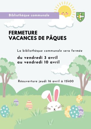 La bibliothèque sera fermée aux dates suivantes pour les vacances scolaires de Pâques.